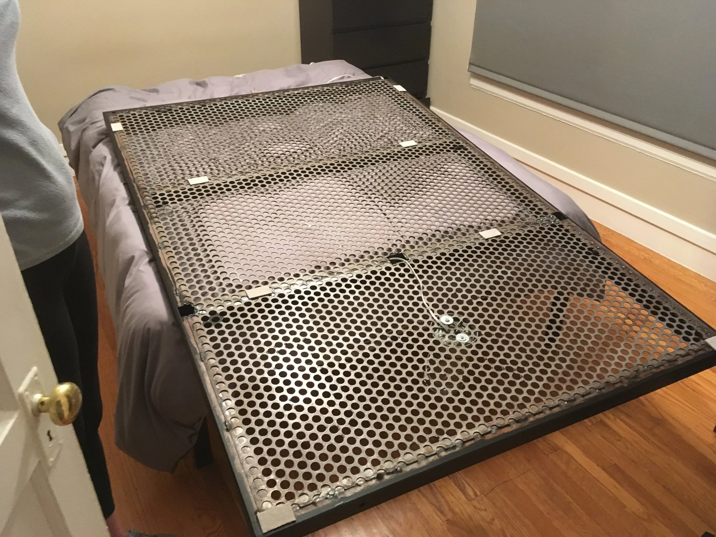 I saw this perforated steel frame in a dumpster, and I had been wanting to give this light fixture a better home. This was built during a kick I had to infuse our furniture with plants. Check out this coffee table for a continuation of that theme.